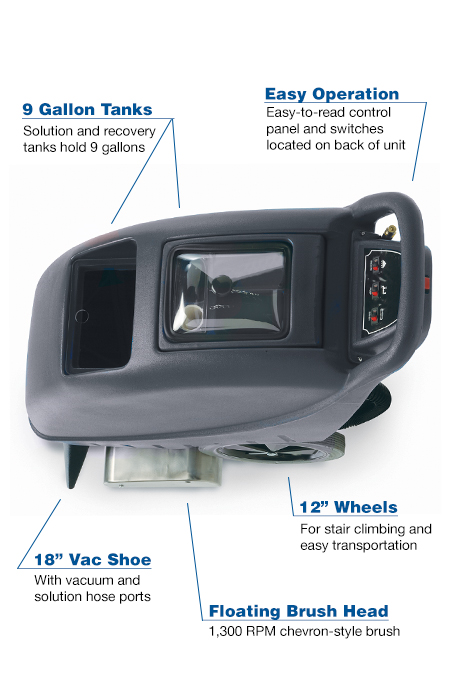 When you have a lot of carpet to clean, this walk-behind upright extractor with a floating brush and a fixed vacuum shoe provides maximum recovery.